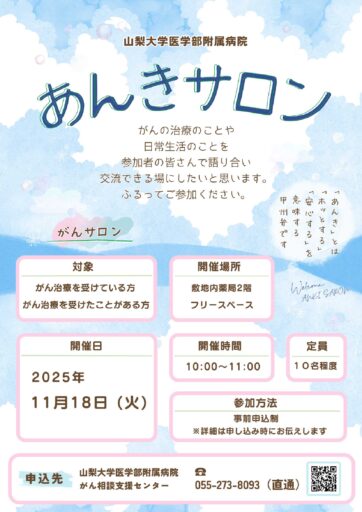 2025年11月18日(火)第3回 山梨大学医学部附属病院 がん相談支援センター主催がんサロン「あんきサロン」を開催いたします。