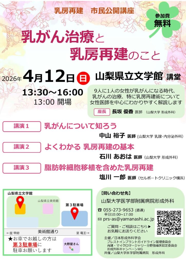 日本形成外科学会主催 当科共催の「乳房再建市民公開講座」が開催されます。