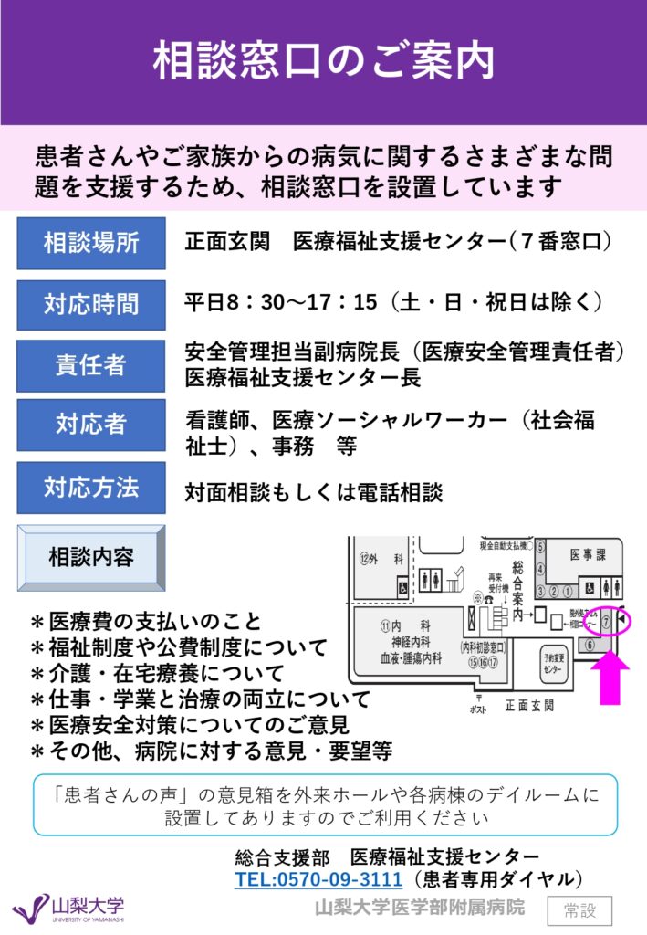 | 医療福祉支援センター | 外来1階7番窓口 受付時間:平日8時30分~17時15分 電 話:患者さん専用ダイヤル(自動音声ガイダンス)0570-09-3111 相談責任者:安全管理担当副病院長(医療安全管理責任者)、 医療福祉支援センター長 相談対応者:看護師、医療ソーシャルワーカー(社会福祉士)、事務 |